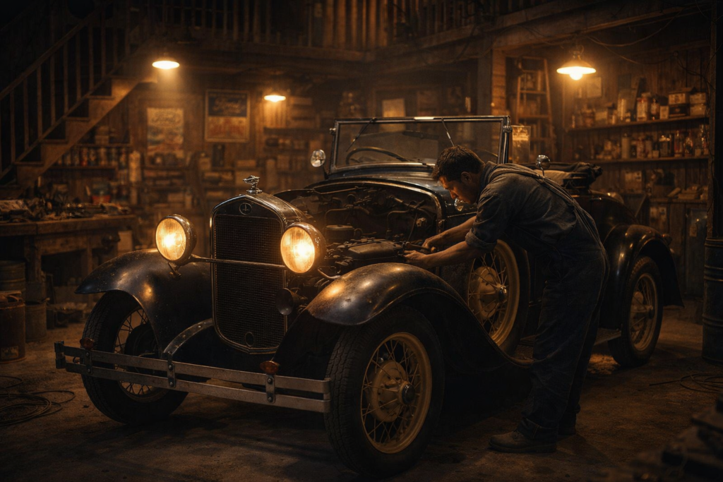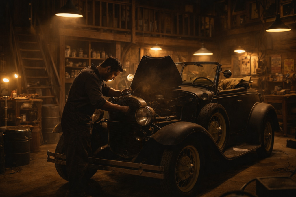 At the center of the scene, a classic vintage car gives life and character to the workshop.